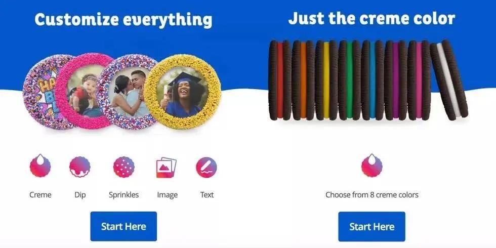 前段時(shí)間,奧利奧首次推出定制餅干服務(wù)。奧利奧提供了兩種定制方式,一種是你的餅干你做主,消費(fèi)者可以自己選擇奶油顏色,紅橙黃綠紫白,盡可挑選。